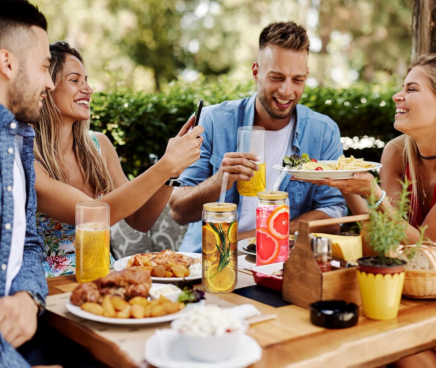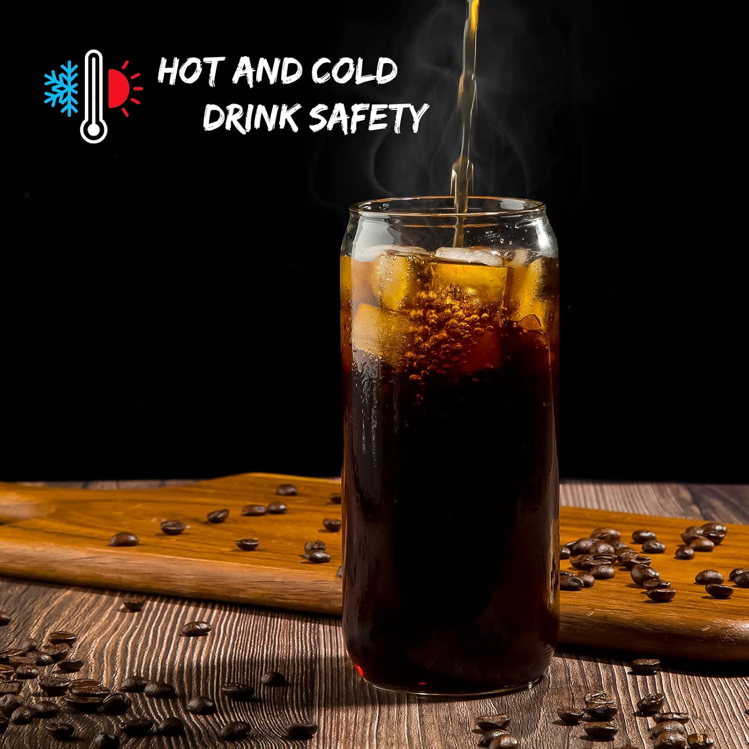 - [ENHANCED DRINKING PLEASURE] 20 oz glass cup set includes 6 glass cups, 6 bamboo lids, 6 glass straws and 2 cleaning brushes. Designed with the smooth and pleasing contours of the similar traditional aluminum can, it is definitely the ideal container for iced coffee, beer, cocktails, milk tea, soda, juice and any beverage you can think of.
