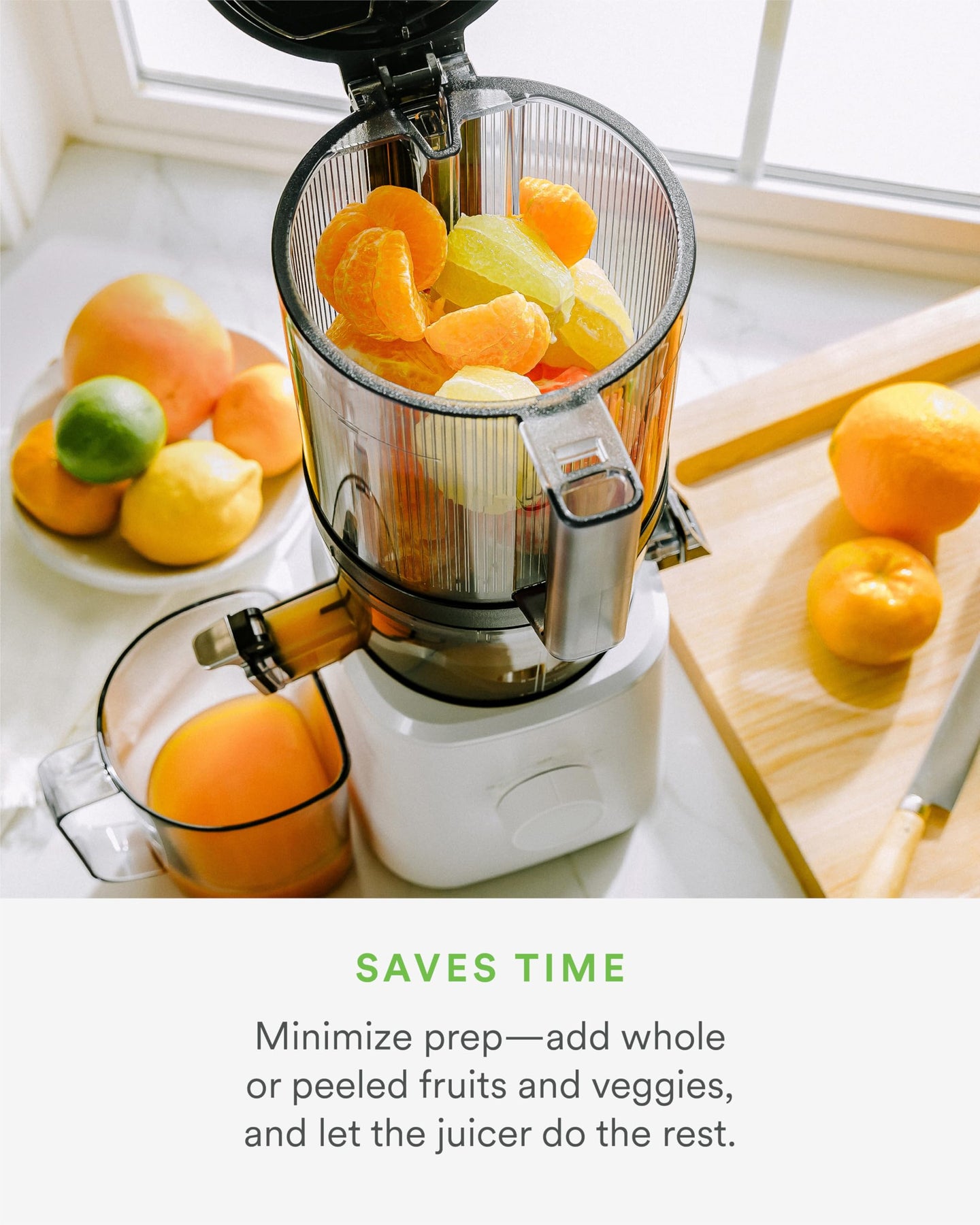 - SAVE TIME: Enjoy your juicing with our cold press juicer machine that cuts & juices produce for you. Simply add your fruits & vegetables & walk away while the J2 processes everything. Just add ingredients & enjoy fresh cold-pressed juice in minutes.